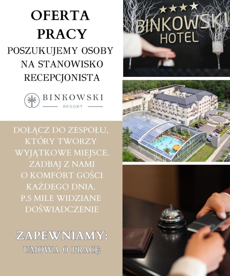Binkowski Resort poszukuje osoby na stanowisko recepcjonisty/recepcjonistki, która dołączy do naszego zespołu i razem z nami zadba o komfort oraz pozytywne doświadczenia Gości, dlatego oczekujemy wysokiej kultury osobistej, komunikatywności, podstawowej znajomości języka angielskiego, umiejętności pracy w zespole oraz dyspozycyjności, mile widziane jest również doświadczenie na podobnym stanowisku, a w zamian oferujemy stabilne zatrudnienie na podstawie umowy o pracę, pracę w przyjaznej atmosferze w renomowanym obiekcie oraz możliwość rozwoju, natomiast zgłoszenia i CV prosimy kierować na adres kariera@binkowskiresort.pl.
